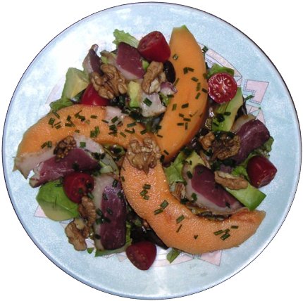 Feuille de chêne Morceaux d'avocat Tranches de melon charentais Tomates cerises Tranches de magret de canard fumé Cerneaux de noix Vinaigrette au vinaigre balsamique