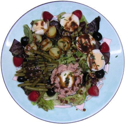 Feuille de chêne Tomates cerises Olives noires Haricots verts cuits à la vapeur Grenailles cuites à la vapeur Rondelles d'œuf dur Thon au naturel Vinaigrette au vinaigre balsamique
