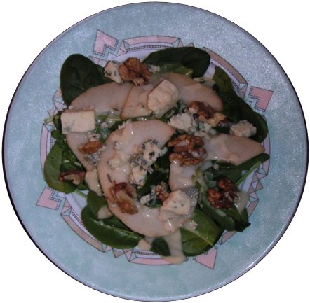 Pousses d'épinard Poire découpée en lamelles Roquefort émietté Cerneaux de noix Sauce Cicrémiel maison