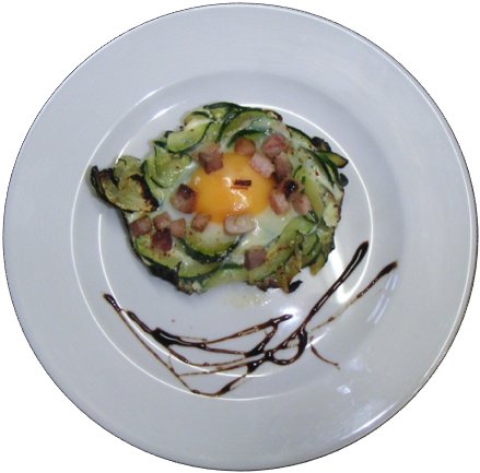 (2 personnes) 1 courgette 2 œufs 2 tranche de pain de mie Persil Piment d'Espelette 1 tranche de poitrine fumée Sel et huile d'olive