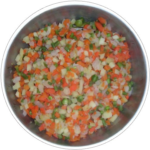 Ajouter les dés de carottes; après 5 minutes les dés de navets; après 5 minutes les dés de pommes de terre, les morceaux de haricots verts et les petits pois.