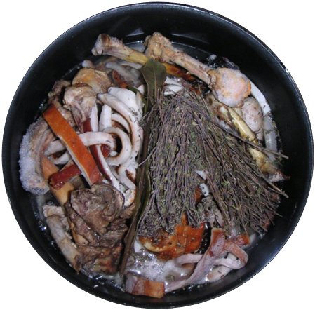Porter à ébullition tous les os, couennes et autres dans de l'eau avec un bouquet garni et 4 clous de girofle.