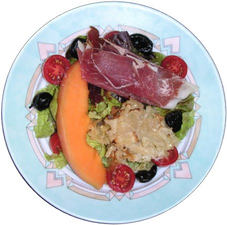 Feuille de chêne Tomates cerises Olives noires Tranches de melon charentais Tranches de jambon fumé Brick de chèvre au miel maison Vinaigrette au vinaigre balsamique