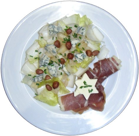 Feuilles d'endives Dés de poires Dés de bleu d'Auvergne Noisettes Jambon d'Auvergne Beurre Vinaigrette huile de noisette, huile de tournesol et vinaigre de cidre