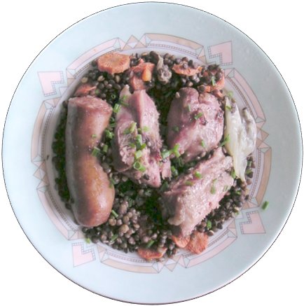 Après une heure de cuisson ajouter les lentilles et les saucisses de Montbéliard.