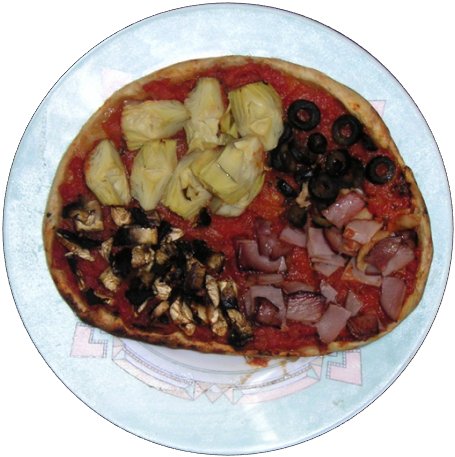 Pâte à pizza fine maison Coulis de tomates maison Bacon ou petits lardons fumés Champignons de paris Fonds ou cœurs d'artichauts Rondelles d'olives noires