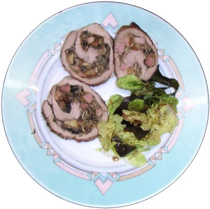 Etaler cette farce sur le filet de porc et rouler le tout. Ficeler l'ensemble. Parsemer le rôti de thym dans un plat allant au four.
