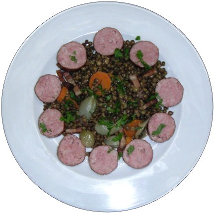 Faire dorer les lardons dans une poêle sèche. Les ajouter avec les grelots glacés et les lentilles égouttées dans la cocotte avec les saucisses.