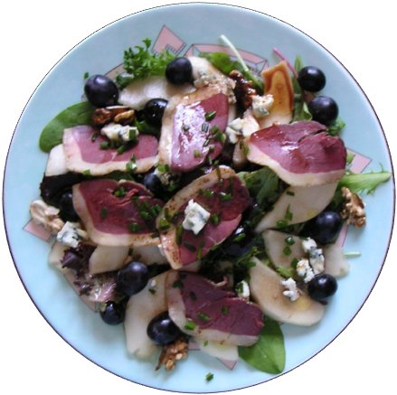 Jeunes pousses de salades Grains de raisin noir Poire découpée en lamelles Roquefort émietté Cerneaux de noix Tranches de magret de canard fumé Vinaigrette au vinaigre balsamique
